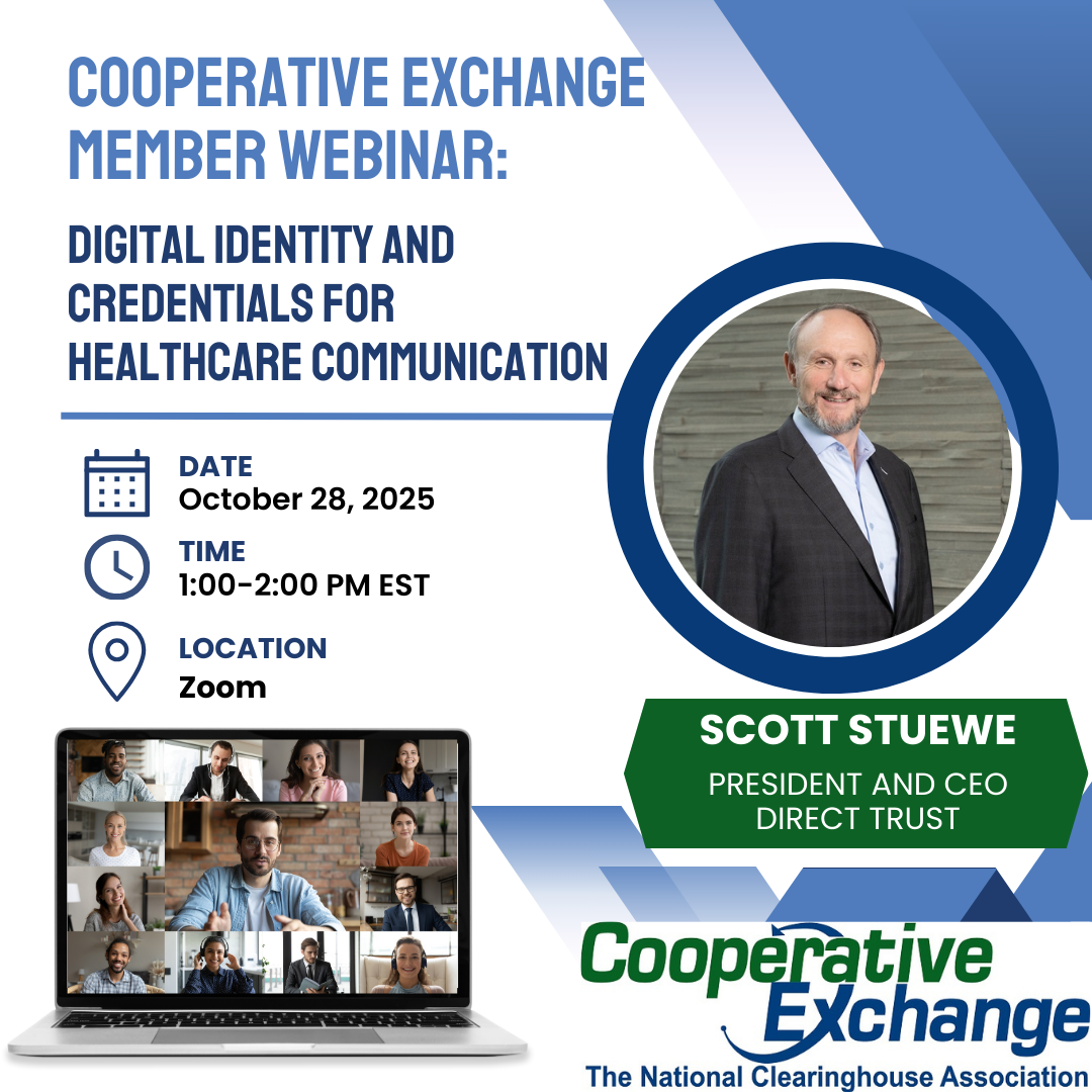 The Cooperative Exchange is the recognized resource and representative of the healthcare transaction clearinghouse industry for the media, governmental bodies and other outside interested parties.